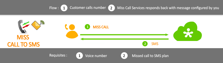 Your customers can place a missed call to a given number at Zero cost to them and receive an SMS in response. The response SMS may be static or customized to include personal and dynamic content. This service can be used for opinion polls, feedback surveys and providing real-time customer-specific information. Multiple voice numbers can be set up in tandem to gather customer opinions about a product, news, social cause or an event.