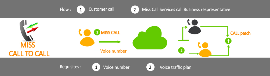 Your customers can place a missed call to your given number at Zero cost to them to receive a call back immediately. Miss Call Services will call your call center or your agents whose numbers are configured in the Missed call service. Miss Call Services will then call back your customer and patch both the calls.